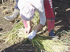 | 自分たちで田植えした田んぼを、今度は自分の手で稲刈り。子どもは遊びの天才といいますが、稲刈りしたところを迷路に見立て、刈り取っては道をつないで遊んでいます。ぽかぽかした陽気なので作業もはかどり、稲束をまとめる作業が追いつきません。 | ||