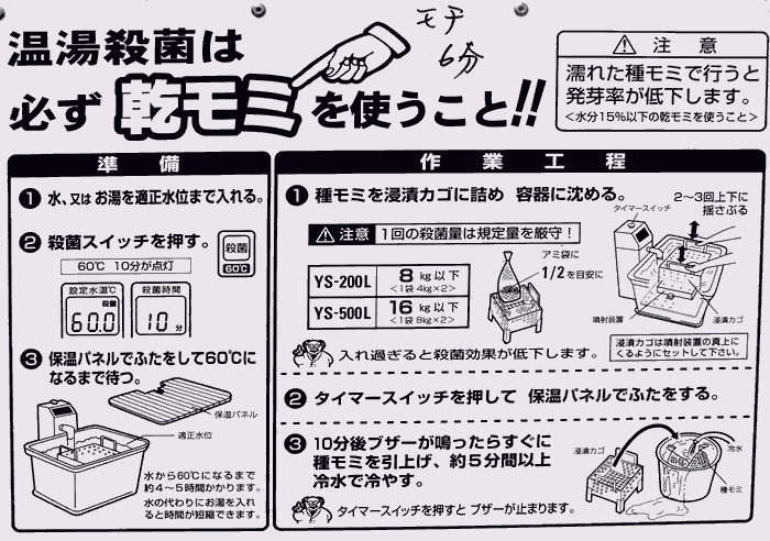 一般的な稲の栽培では薬品による種籾の消毒を行います。アイガモ農法・有機栽培では、無農薬で消毒するために温熱処理が行われています。昨年までは、川内村で稲の有機栽培に取り組む農家は、大熊町まで行って消毒をしていたそうです。有機栽培に取り組む農家が増え、消毒の器械も増えたことから、今年は川内村で消毒作業が行われました。 装置の使用説明にあるように、乾燥した種籾を使います。水分のある種籾を使用すると、温度管理が徹底されません。発芽率が落ちてしまいます。これから消毒する種籾は「12.1%」に乾燥させてあります。